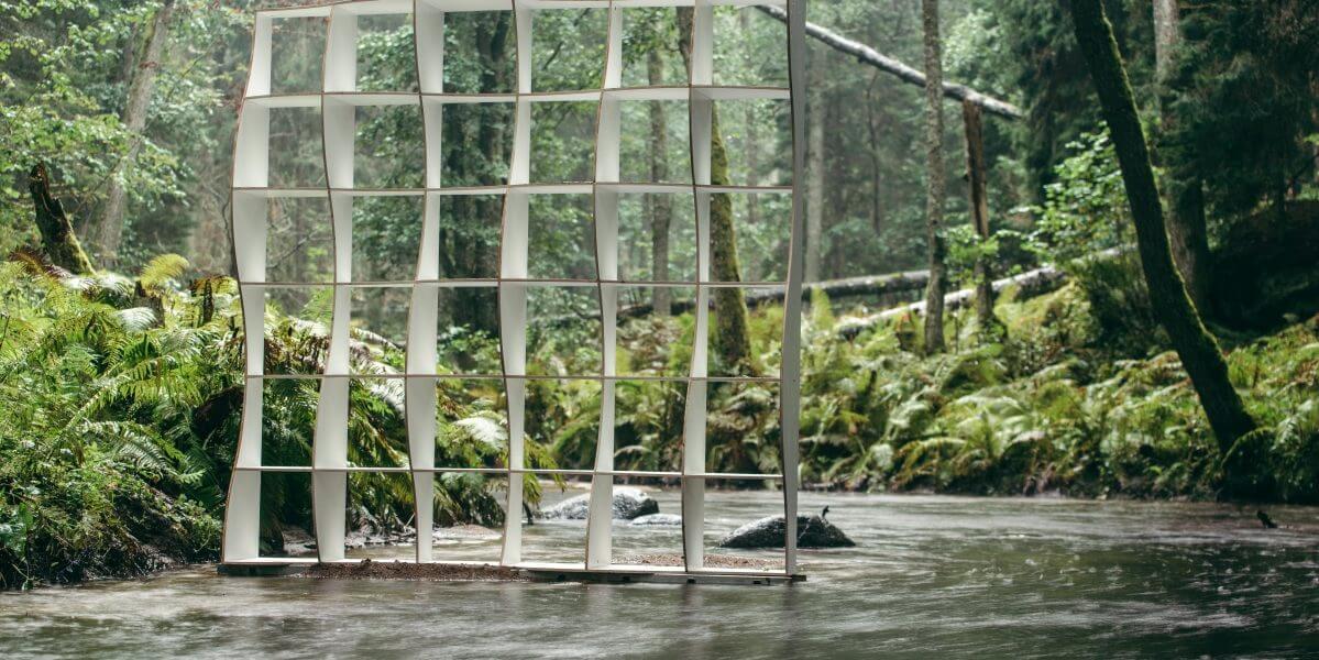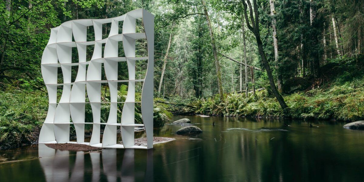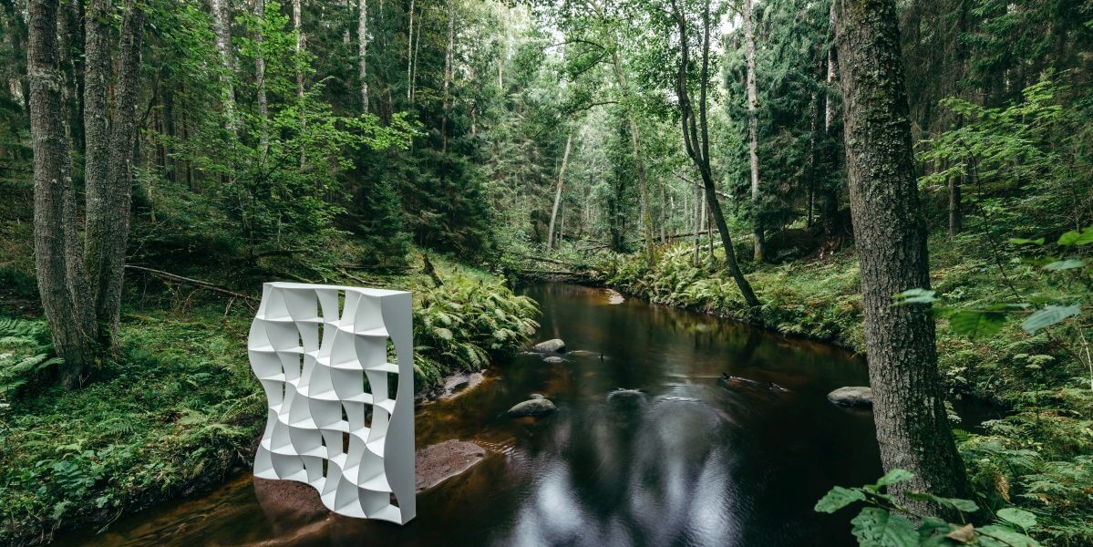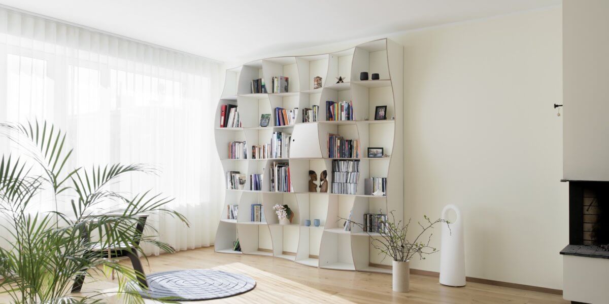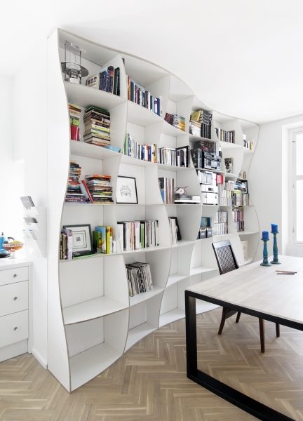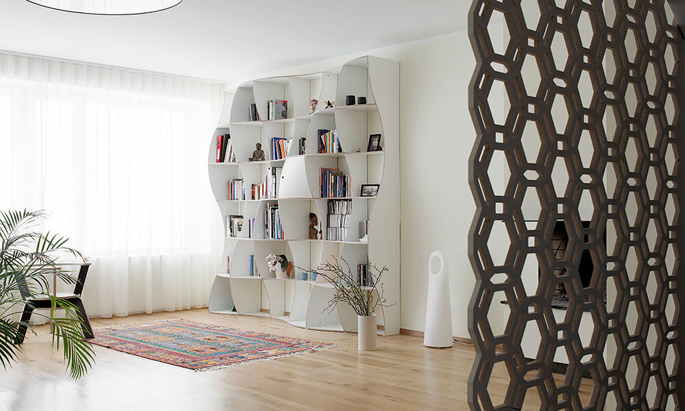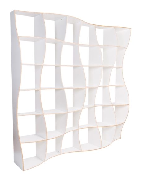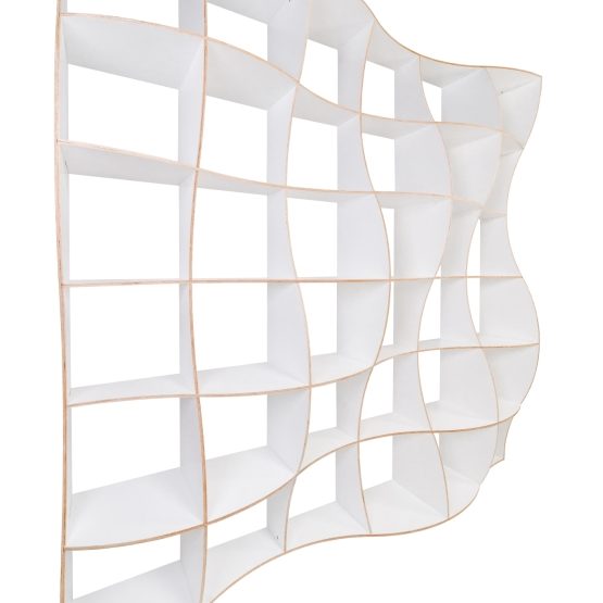 DUNE was inspired by various natural shapes – sand-dunes, flowing water, fractality. The shelf is based on the principle of the Flower of Life and the Golden ratio that appeals to the human eye through its ideal proportion. The winding curves of the shelf seem spontaneous at first glance but actually the wave is based on an algorithm that reoccurs after every fifth span. The repetition is created by three elements with different shapes in both vertical and horizontal levels. The algorithm is not computer generated but created by the designer.