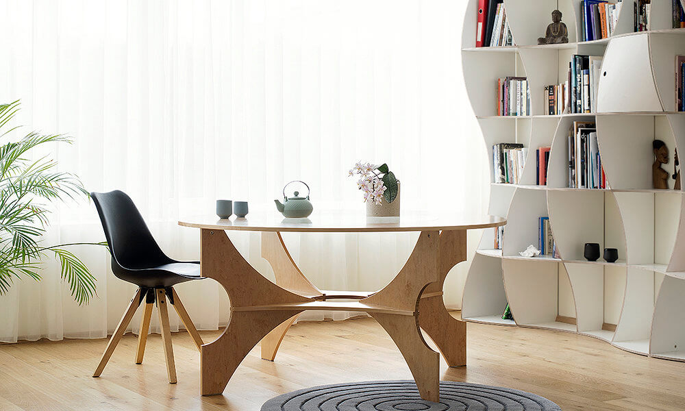 While designing the shelf the artist aimed to use material as waste free as possible, enabled by the placement of the details and perfect fit of the arcs that are cut out with a joint line for two elements. The spacious Dune can be used as a wall shelf or as a room divider. The shelf is easy to assemble according to instructions due to a dovetail joint and simple tablet fixtures.